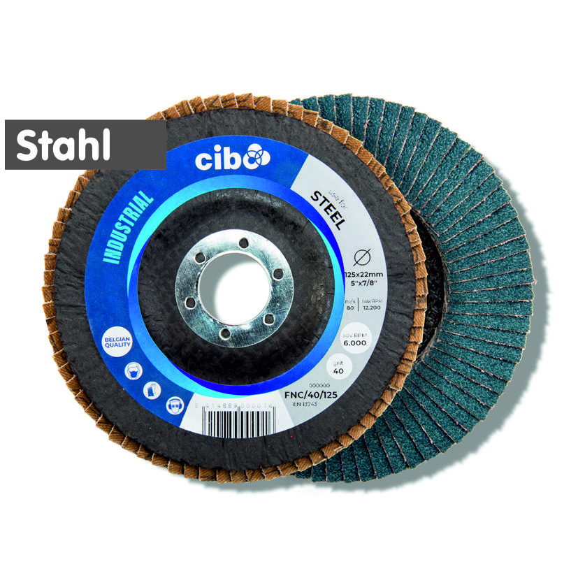 Mit der Industrial-Linie bietet Cibo ein Sortiment an Fächerschleifscheiben mit einem idealen Preis-Leistungs-Verhältnis . Die Industrial-Stahlscheibe ist die perfekte Einstiegsscheibe für die Bearbeitung von Stahl. Dank des speziell entwickelten flexiblen Leinens erreicht diese Scheibe auch bei geringerem Druck sofort einen hohen Wirkungsgrad. In Kombination mit dem hochwertigen Korn aus 100 % Zirkonium sorgt die Industrial-EStahlscheibe für beste Effizienz bei niedrigem Druck und weniger leistungsstarken Maschinen von 750 Watt.