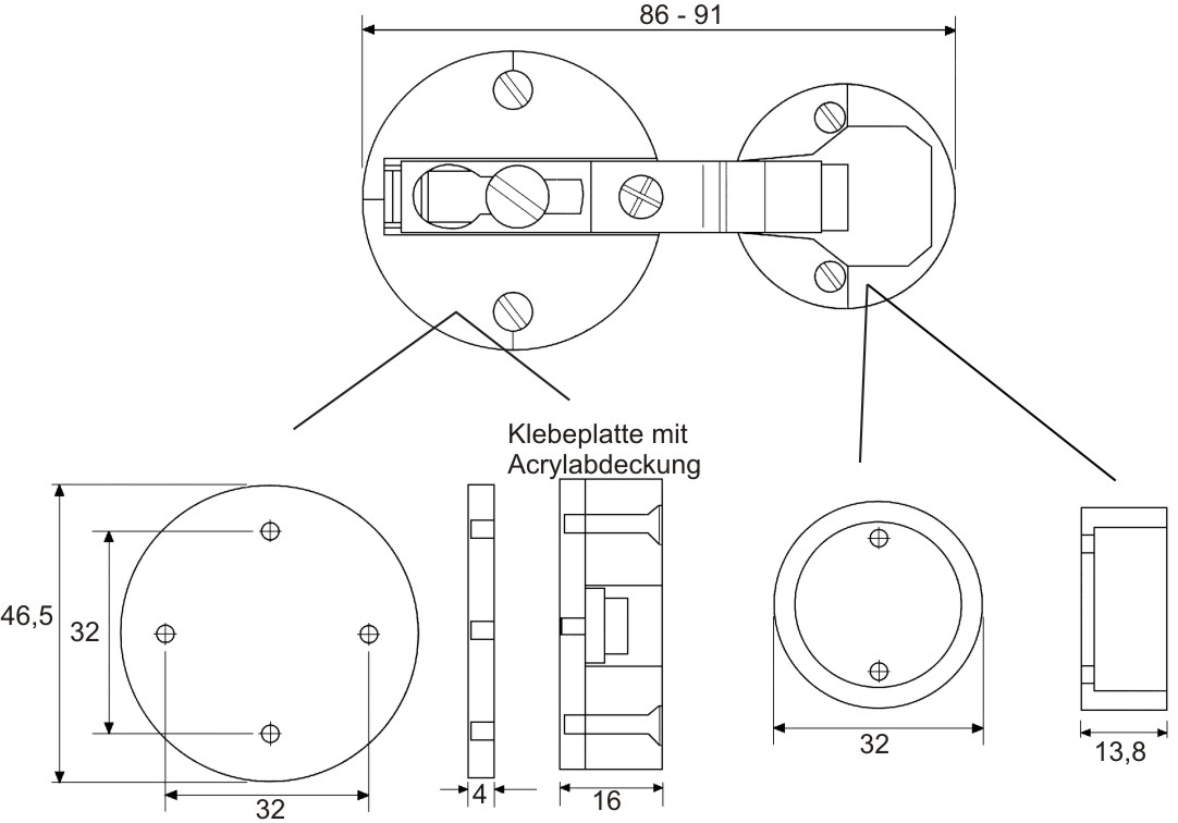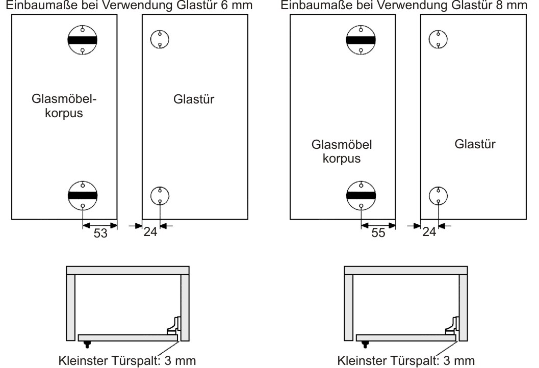 Glastürscharnier für einliegende Glastüren, zum UV-Verkleben, mit Schnäpperfunktion,