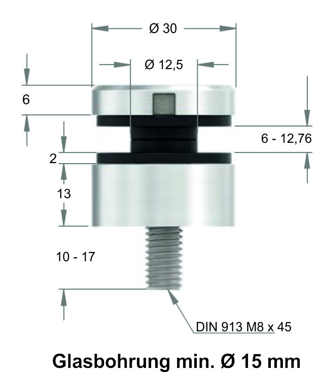 Punkthalter Ø 30 mm, für 6 - 12,76 mm Plattendicke, inkl. schwarzem Glasschutz-Set und Gewindestift M8 x 45 mm